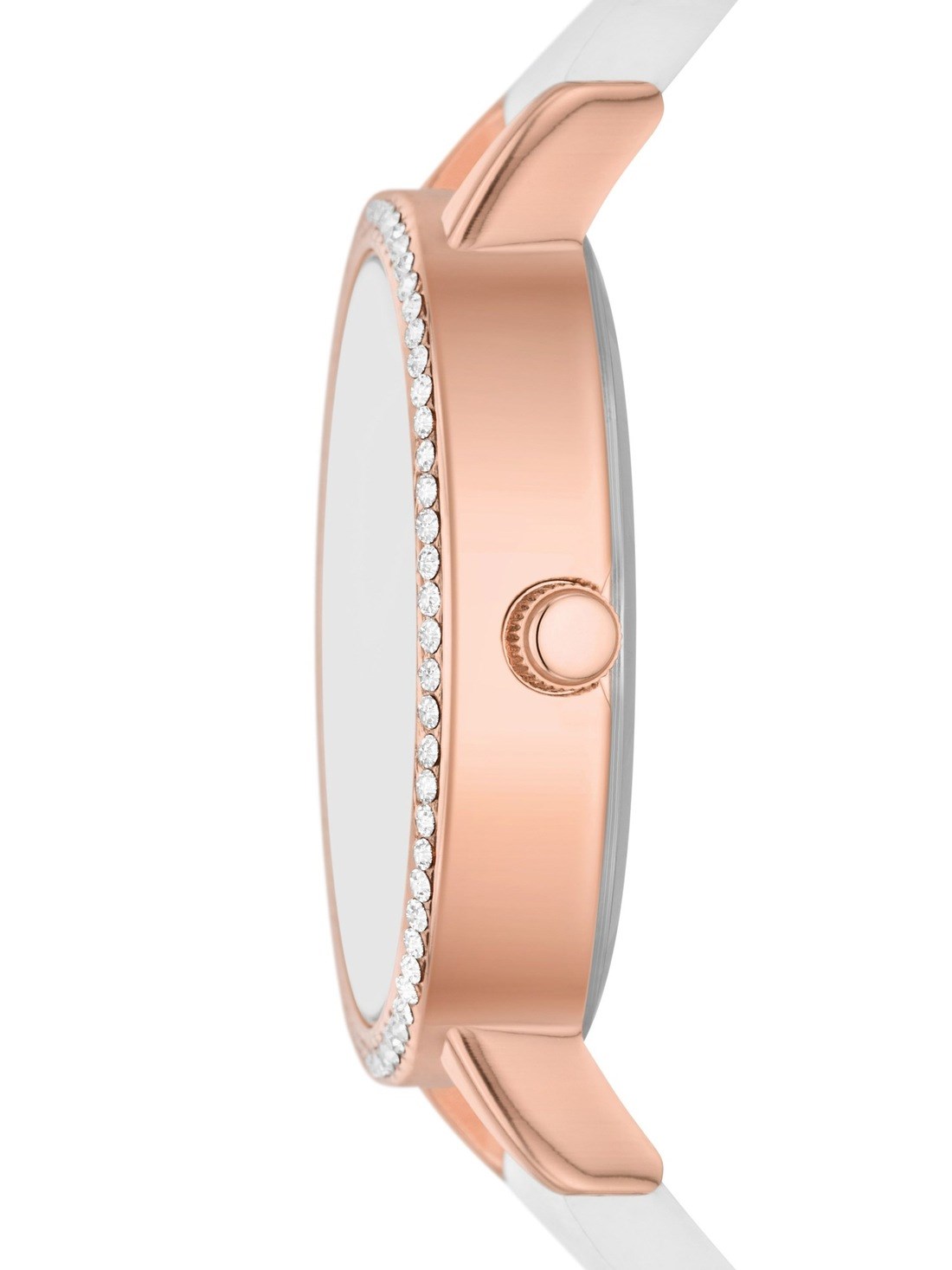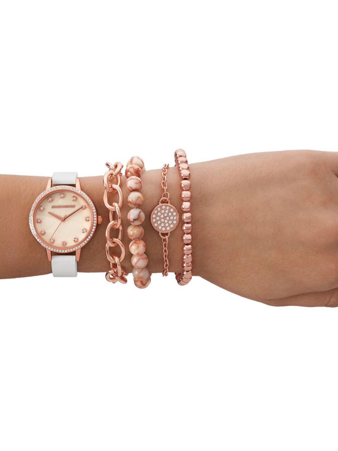 Short Description Mix and match your accessories with this white and rose gold-tone gift set from Skechers. The watch features a glitz bezel and genuine mother of pearl dial with white vegan leather strap and includes 4 rose gold-tone bracelet accessories.