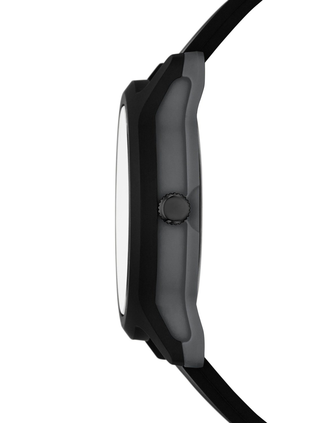 Round polycarbonate case, with a black dial.