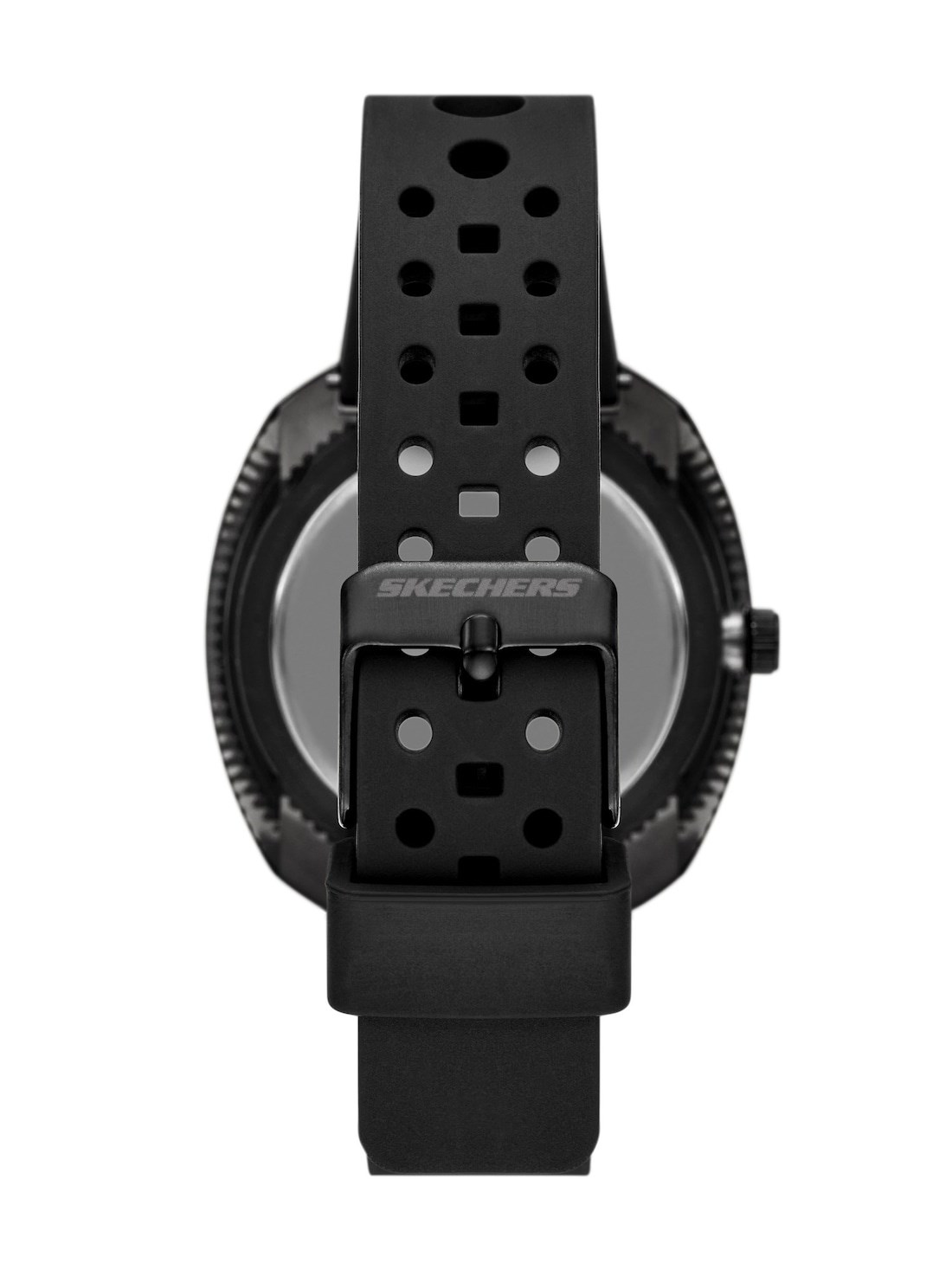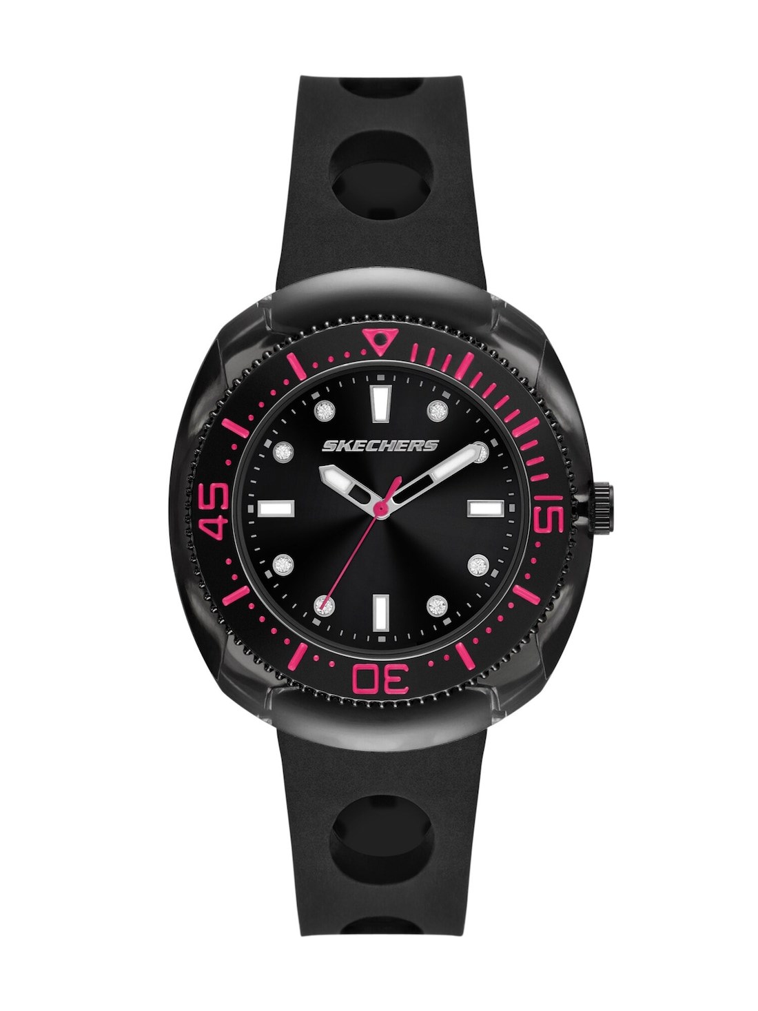 Short Description Strap on some style with this perforated black silicone watch from Skechers. The 40mm cushion-shaped translucent case houses a black sunray dial, protected by a durable mineral crystal. With a three-hand movement and comfortable silicone strap, this watch effortlessly combines everyday practicality with a chic, modern look. Perfect for any setting, it's the go-to accessory to elevate your outfit.