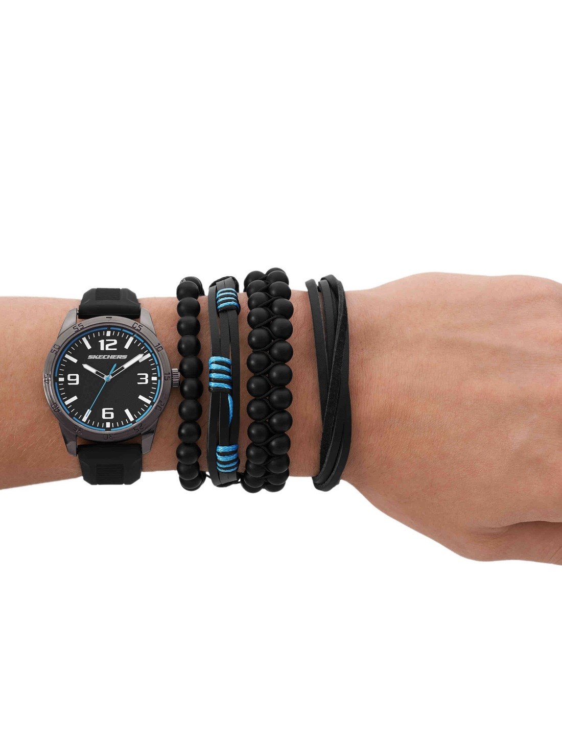Short Description This casual and cool Men's' gift set from Skechers features a black watch and 4 bracelet accessories with pops of turquoise tones.