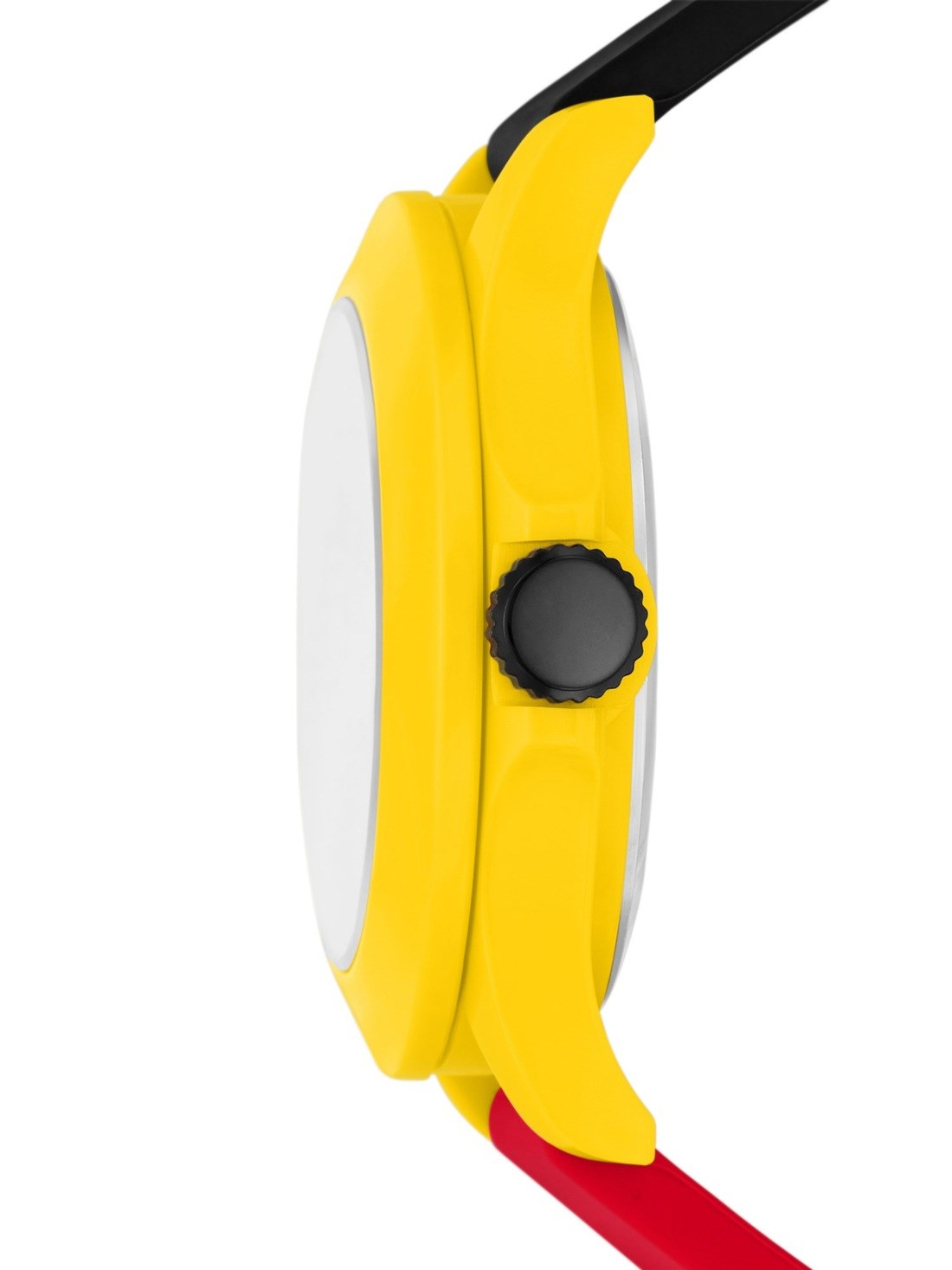 Short Description Inspired by Belgium's national colors, this silicone watch features a yellow case, a black upper strap, and a red lower strap. The semi-gloss yellow dial adds a striking, cohesive finish to its sporty design.