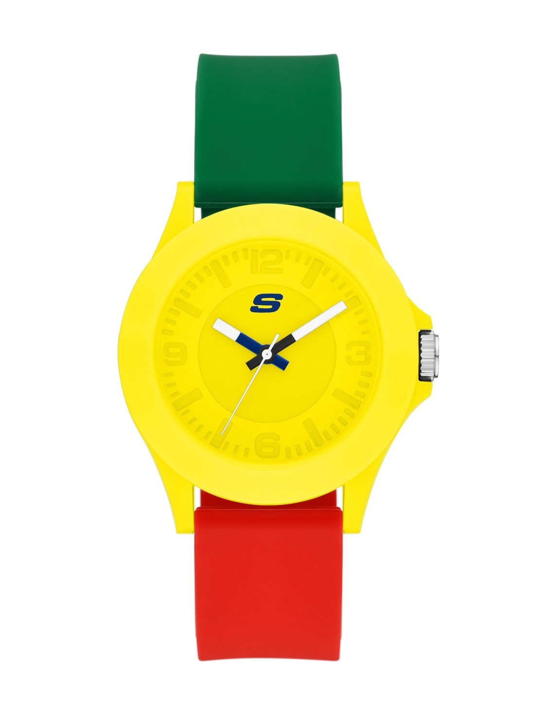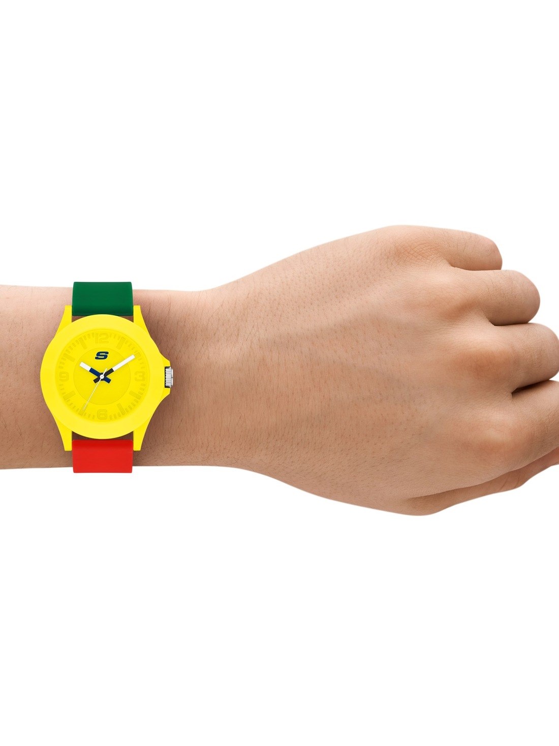 Short Description Designed for sports enthusiasts, this watch showcases a vibrant yellow case, semi-gloss dial, and multicolor silicone strap inspired by Portugal's national colors.