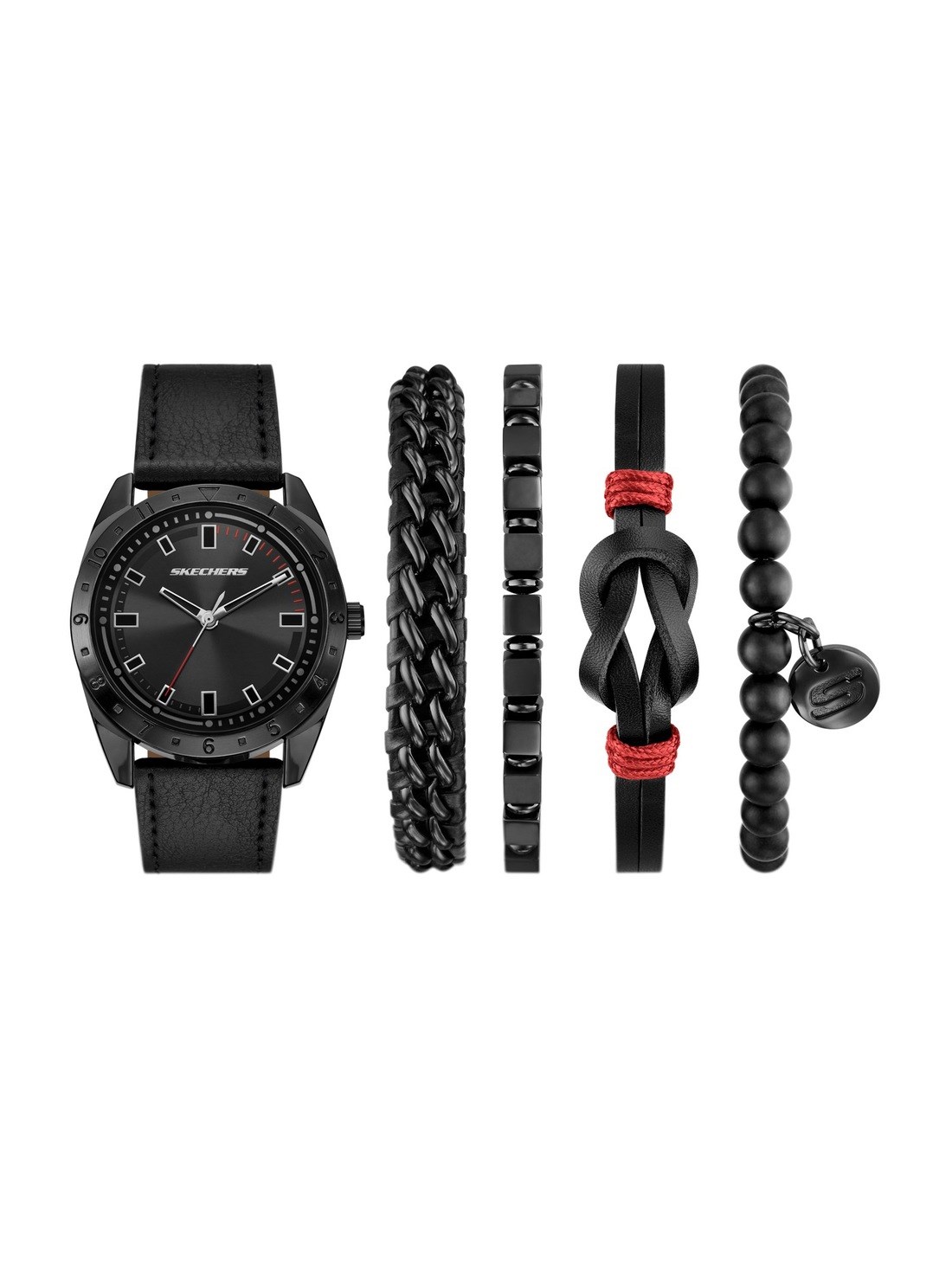 Short Description This sleek black watch pairs a bold round case with a textured strap and sunray dial. Four stackable bracelet accessories add versatility to your look.