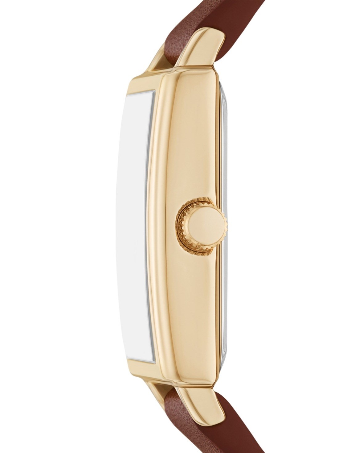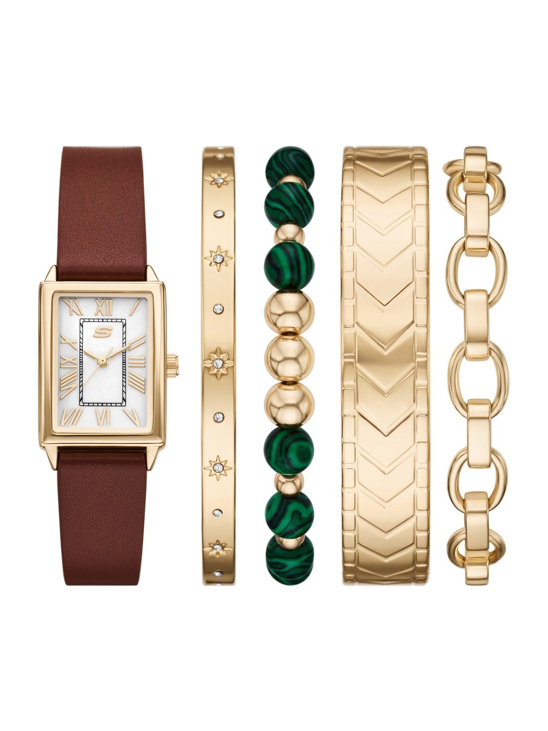 Short Description This sleek gold-tone watch pairs a rectangular case with a mother-of-pearl dial and a soft brown strap. The set includes four stackable bracelet accessories.