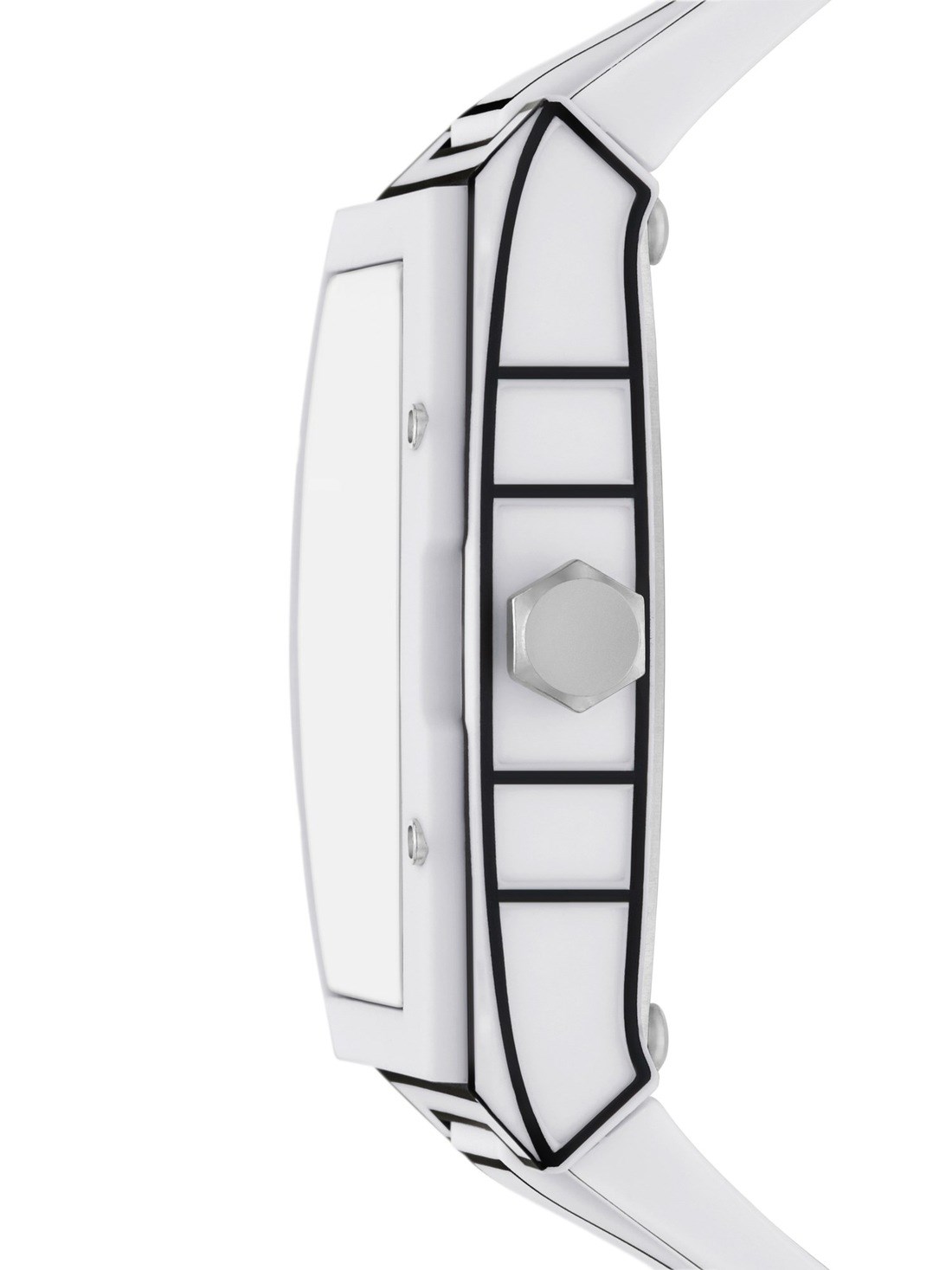 Short Description This barrel-shaped watch features a bold white case with black outlining for a graphic, comic-inspired look. Gear detailing on the novelty dial adds playful dimension.