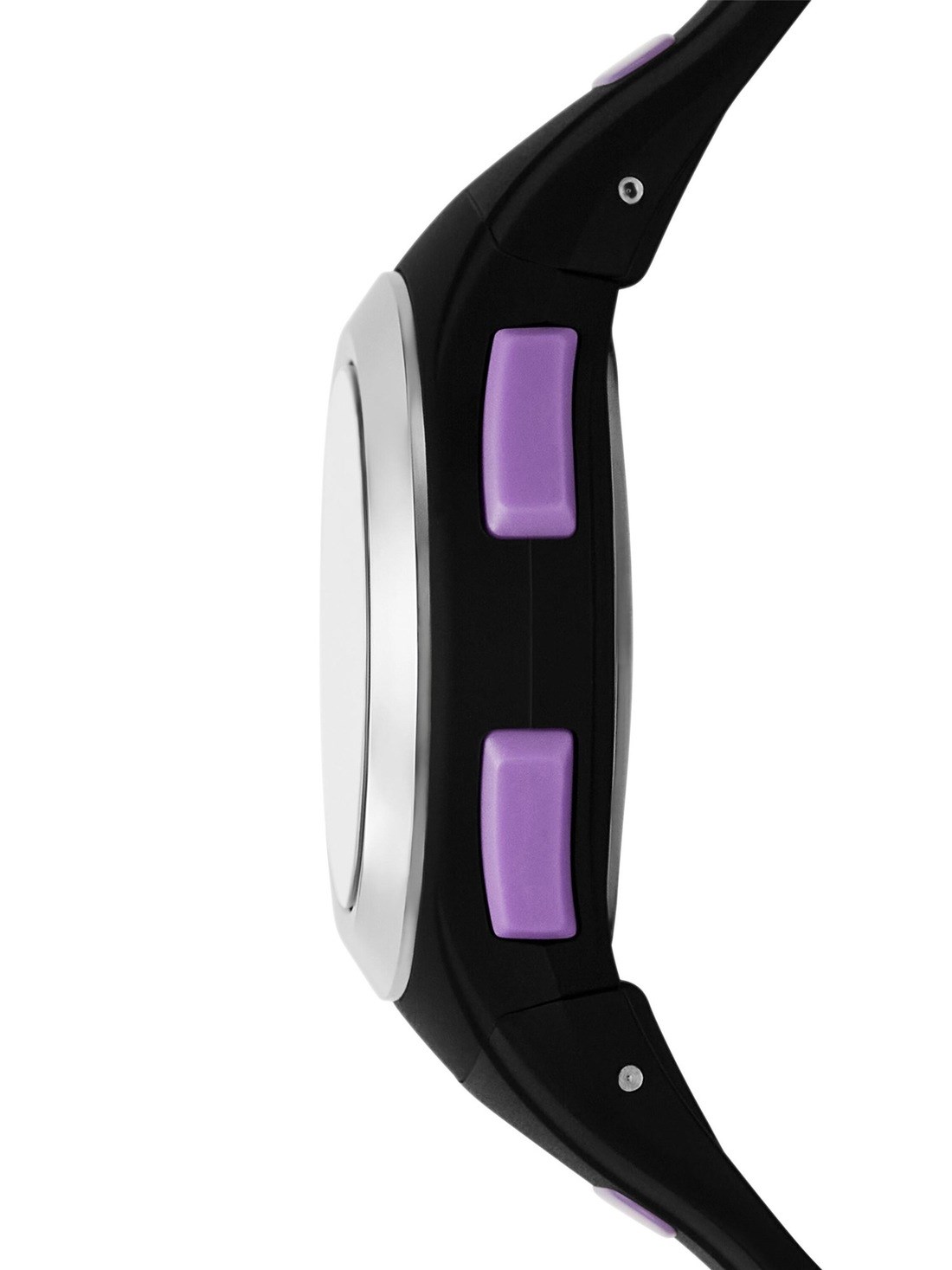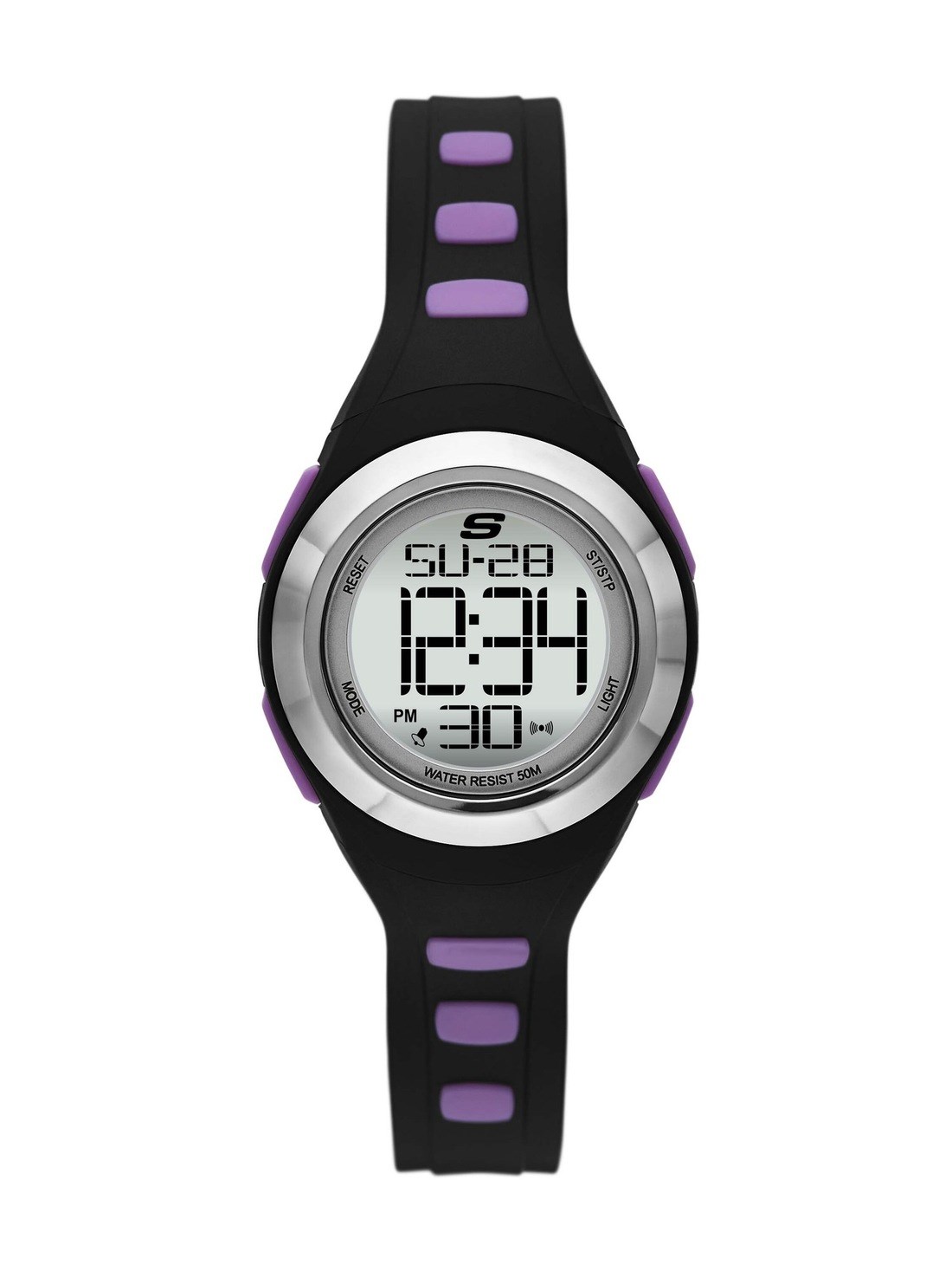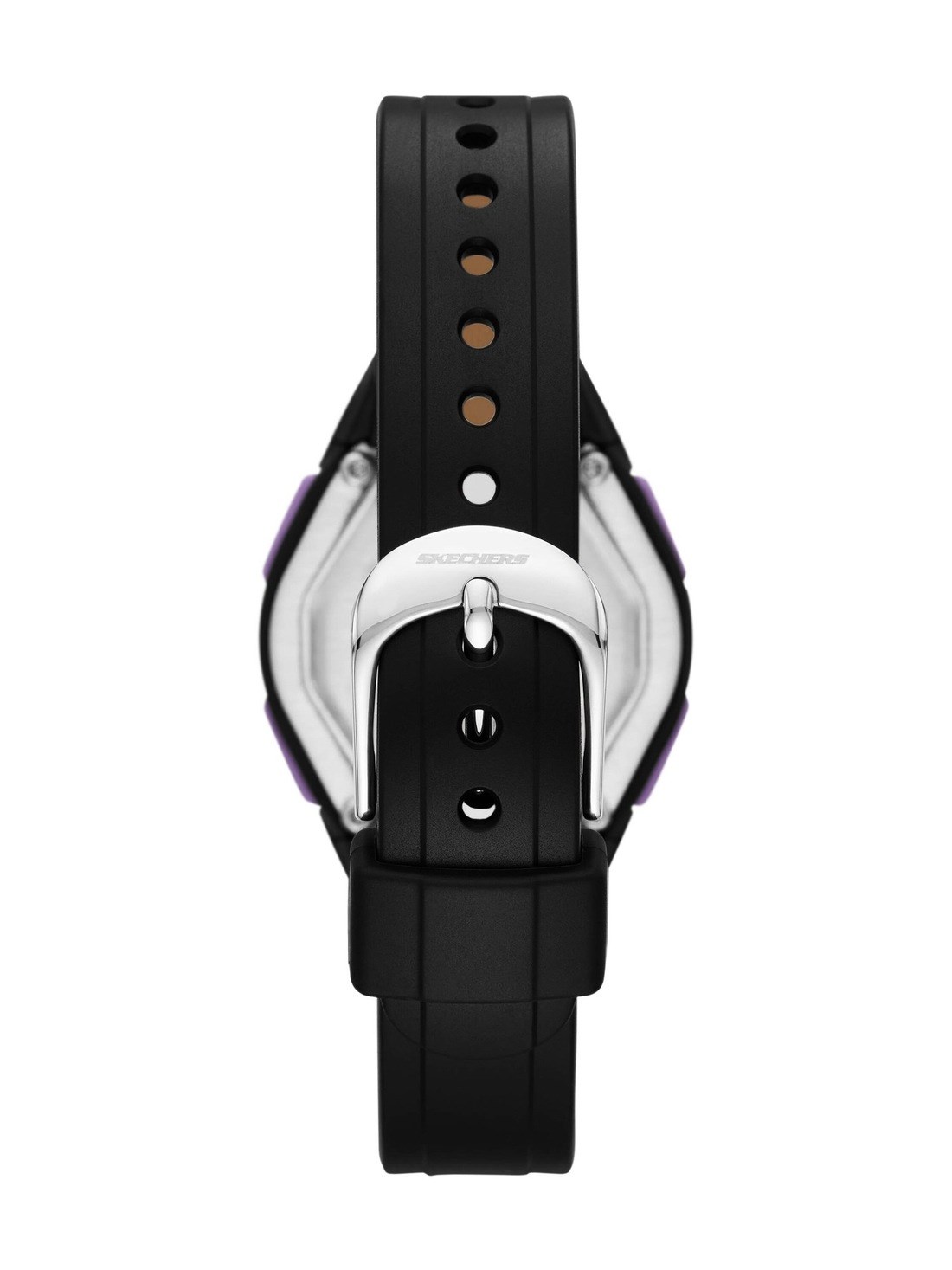 Short Description Keep your look sporty and smart with the Skechers Tennyson Watch. It features a black silicone strap, metal bezel, and purple color pops. The positive digital display features a chronograph stopwatch, 12/24-hour and dual time formats, calendar and daily alarm as well as backlight.