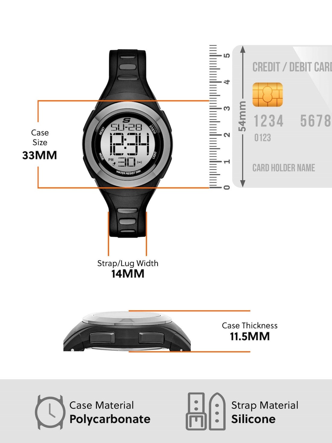 Watch Features Skechers; Skechers Watches; Skechers Watches for Women; Black Watches; Silver Watches; Black Watches For Women; Silver Watches For Women; Digital Watch; Digital Watch For Women; Sport Watch; Sport Watch For Women; Tennyson; Chronograph, Stopwatch; Split Time; 12 Hour; 24 Hour; Dual Time; Calendar; Day; Date; Alarm; Chime; 33MM; 5ATM; Water Resistant; Hand Washing; Shower; Bathing; EL Backlight; Warranty; Female; Adult; Plastic; Athleisure; Fashion; Sport; Athletic; Work Out; Yoga; Pilates; Running; Walking; Cleaning; Work; Round; Battery;