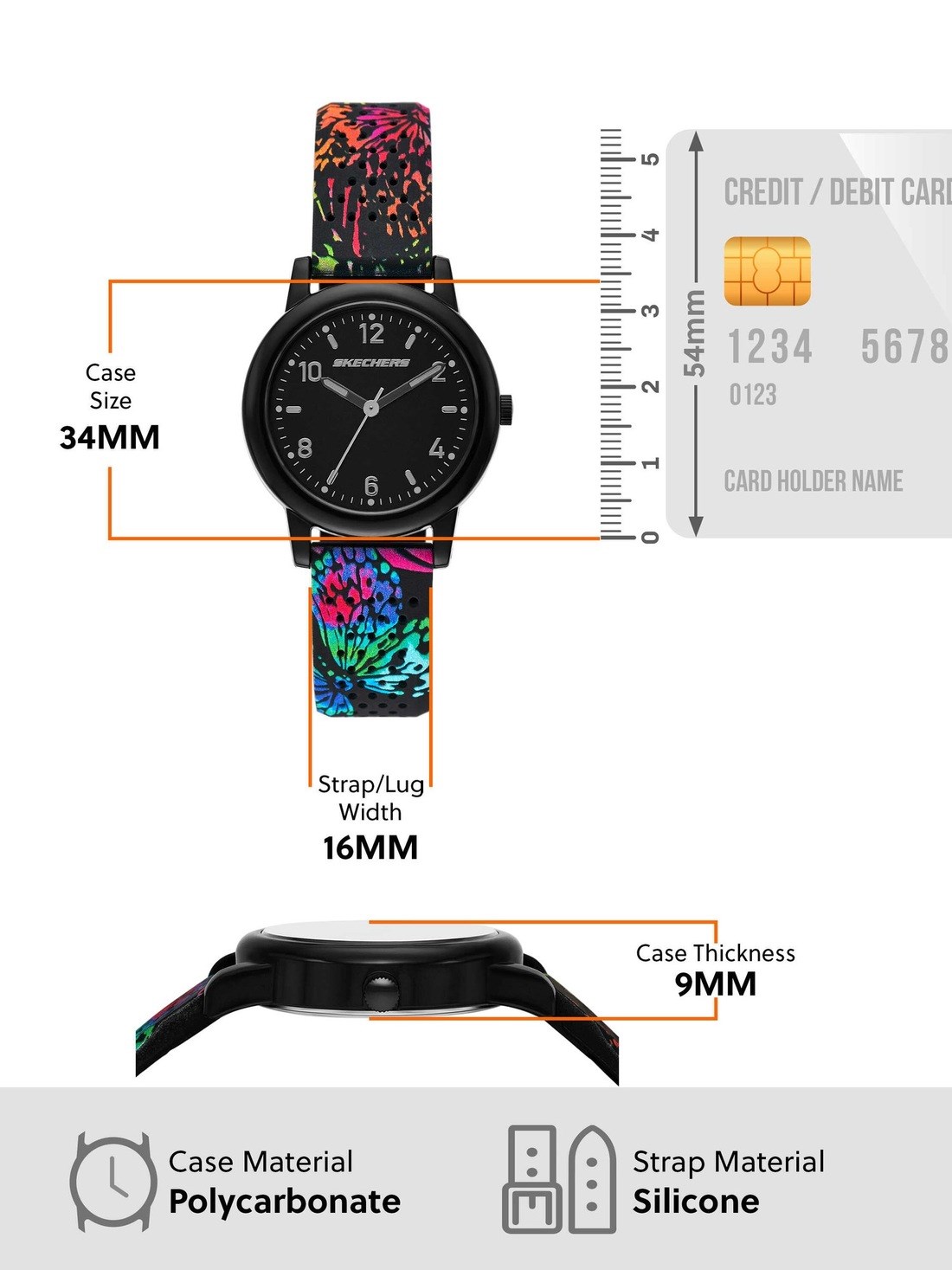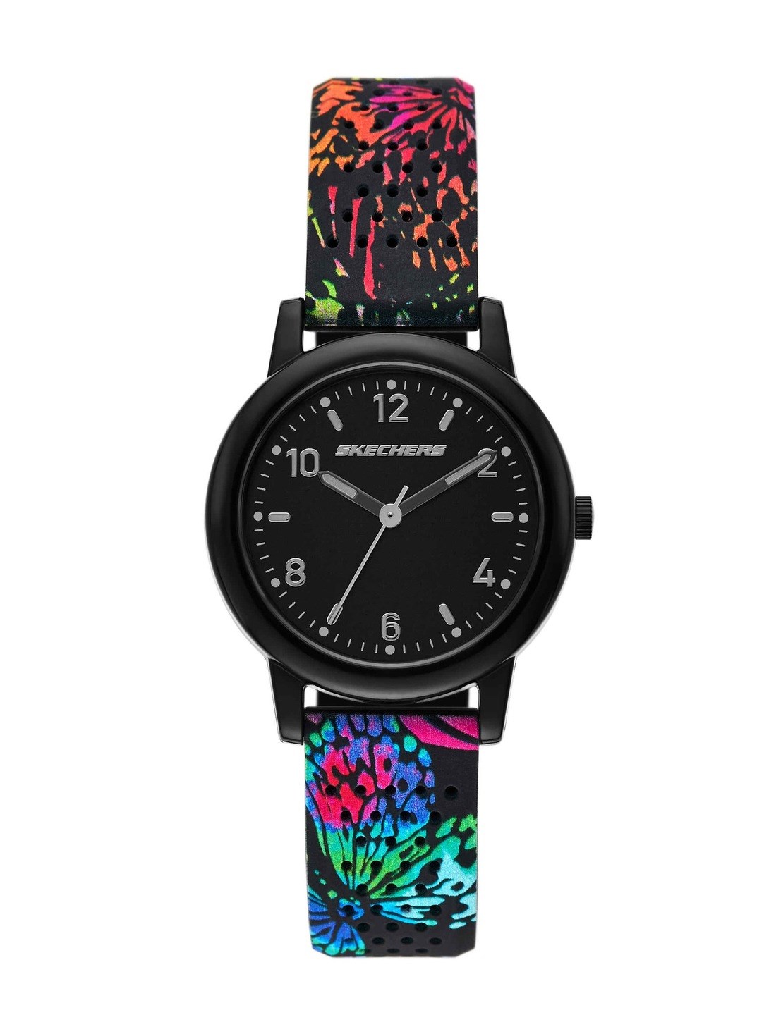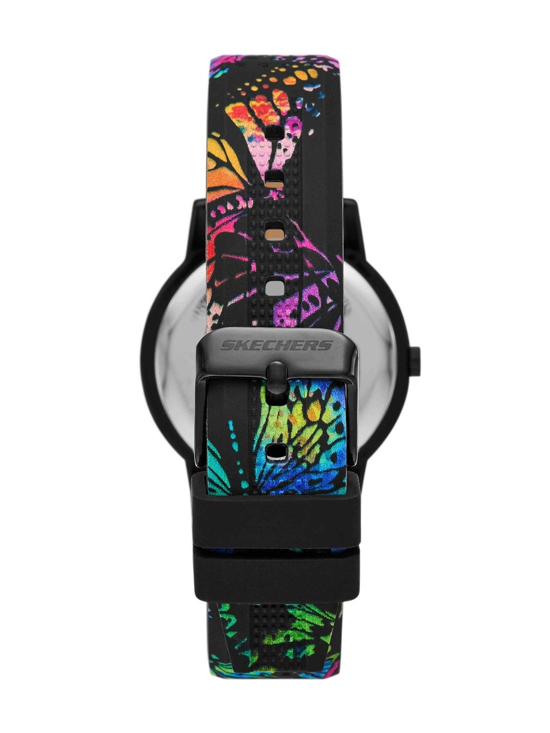 Short Description Add flair to your outfit with the Skechers Toluca quartz analog watch that features a black plastic case black butterfly print soft silicone strap.